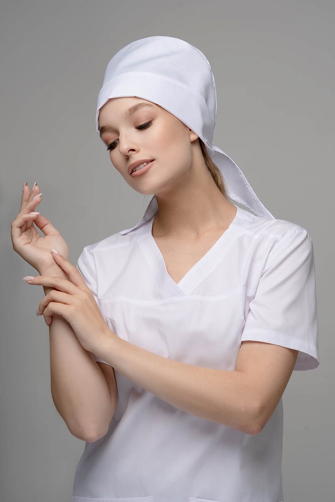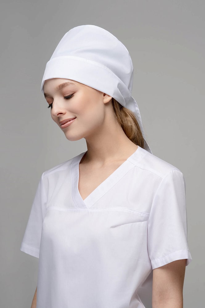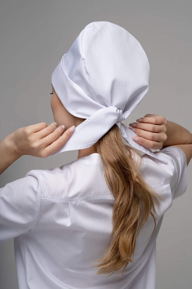 Удобная и практичная белоснежная модель медицинского головного убора  - это косынка. Концы боковой части исполняют роль завязки  для регулировки размера. Высота косынки спереди - 20,0 см (при ширине отворота - 4,0 см). Ткань обеспечивает безупречный внешний вид, содержит много хлопка.