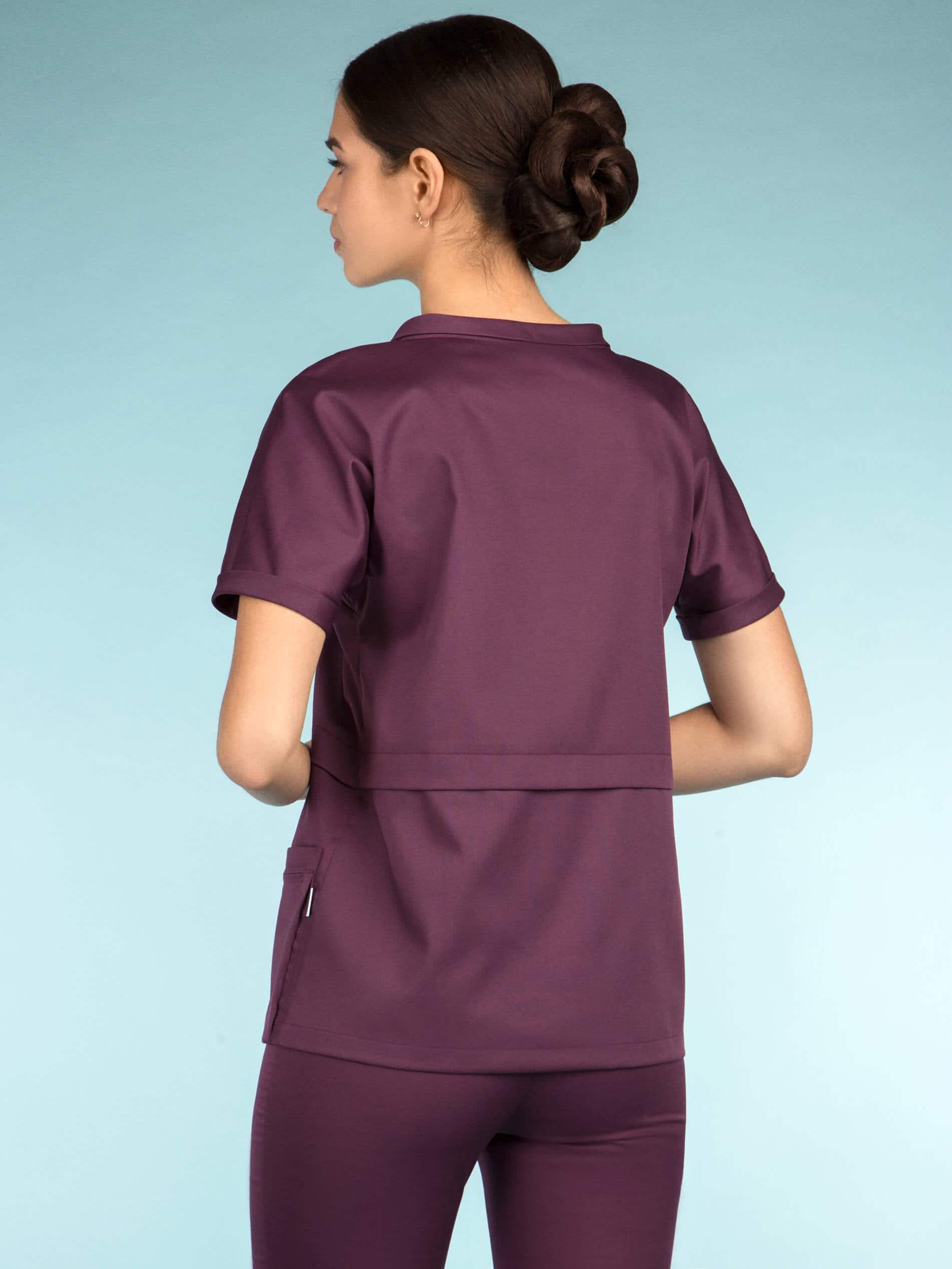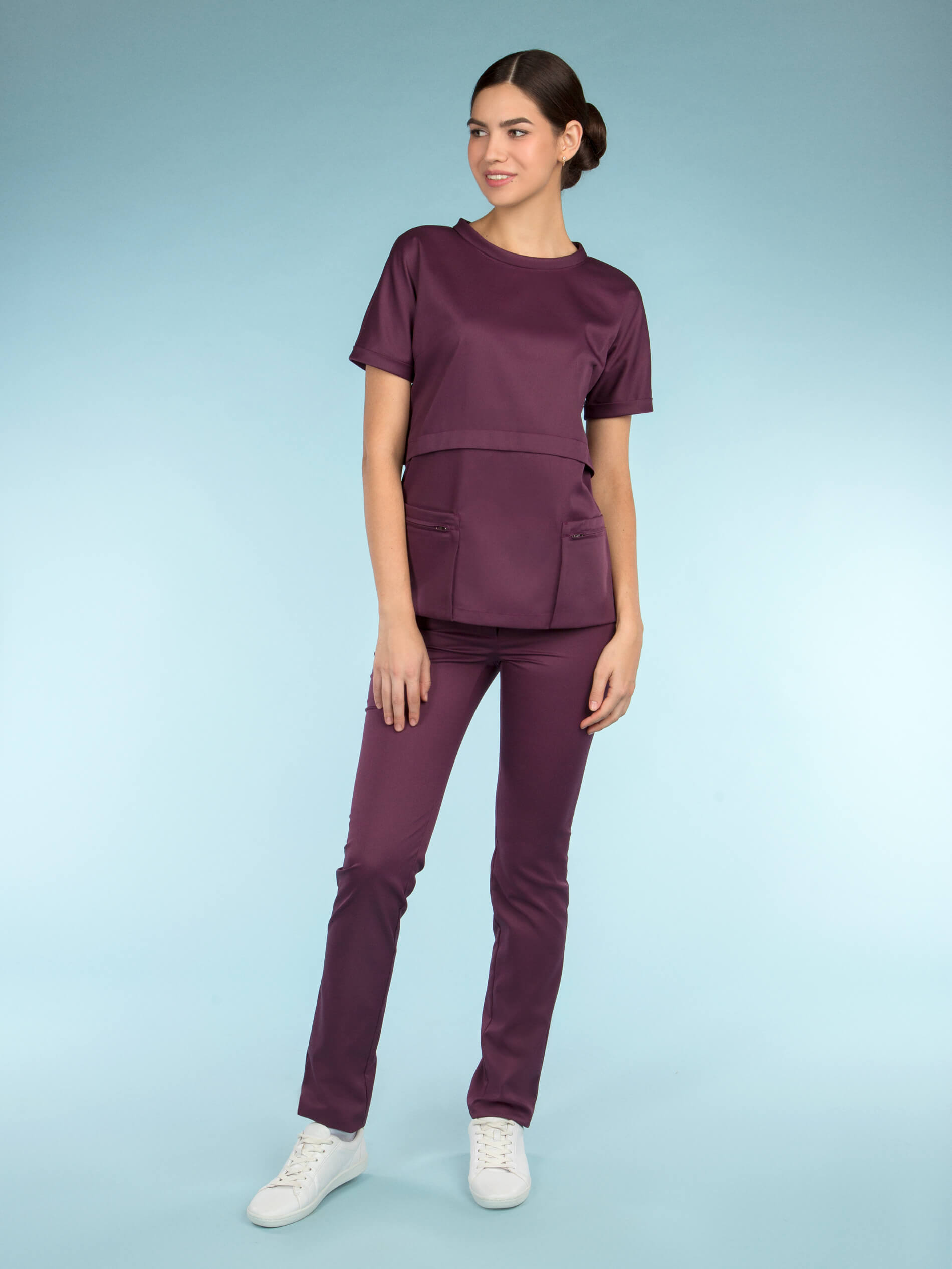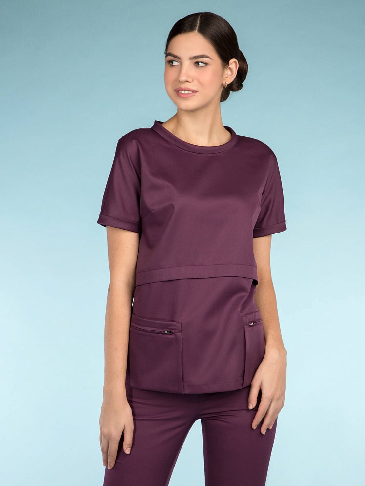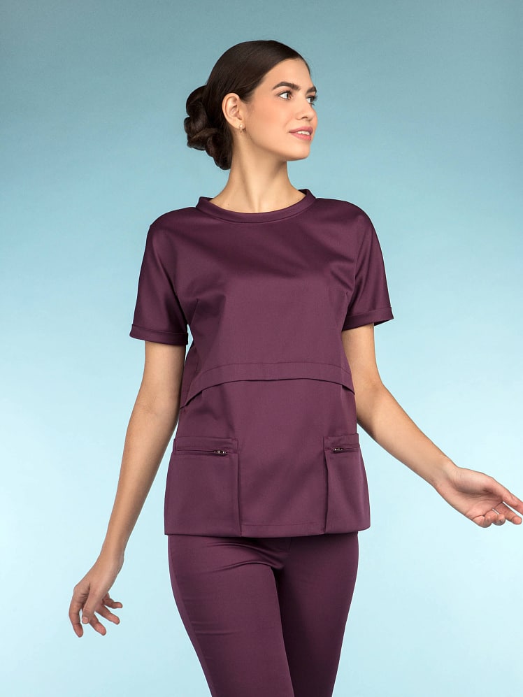 Молодежная блуза выглядит стильно, но позволяет оставаться в рамках дресс-кода. Рез фигурной формы и складки, кажущаяся многослойность скрывают недостатки фигуры и приближают свою обладательницу к совершенству. Привлекают особое внимание графичные карманы – портфели, застегивающиеся на молнию и элегантный воротник "хомут".