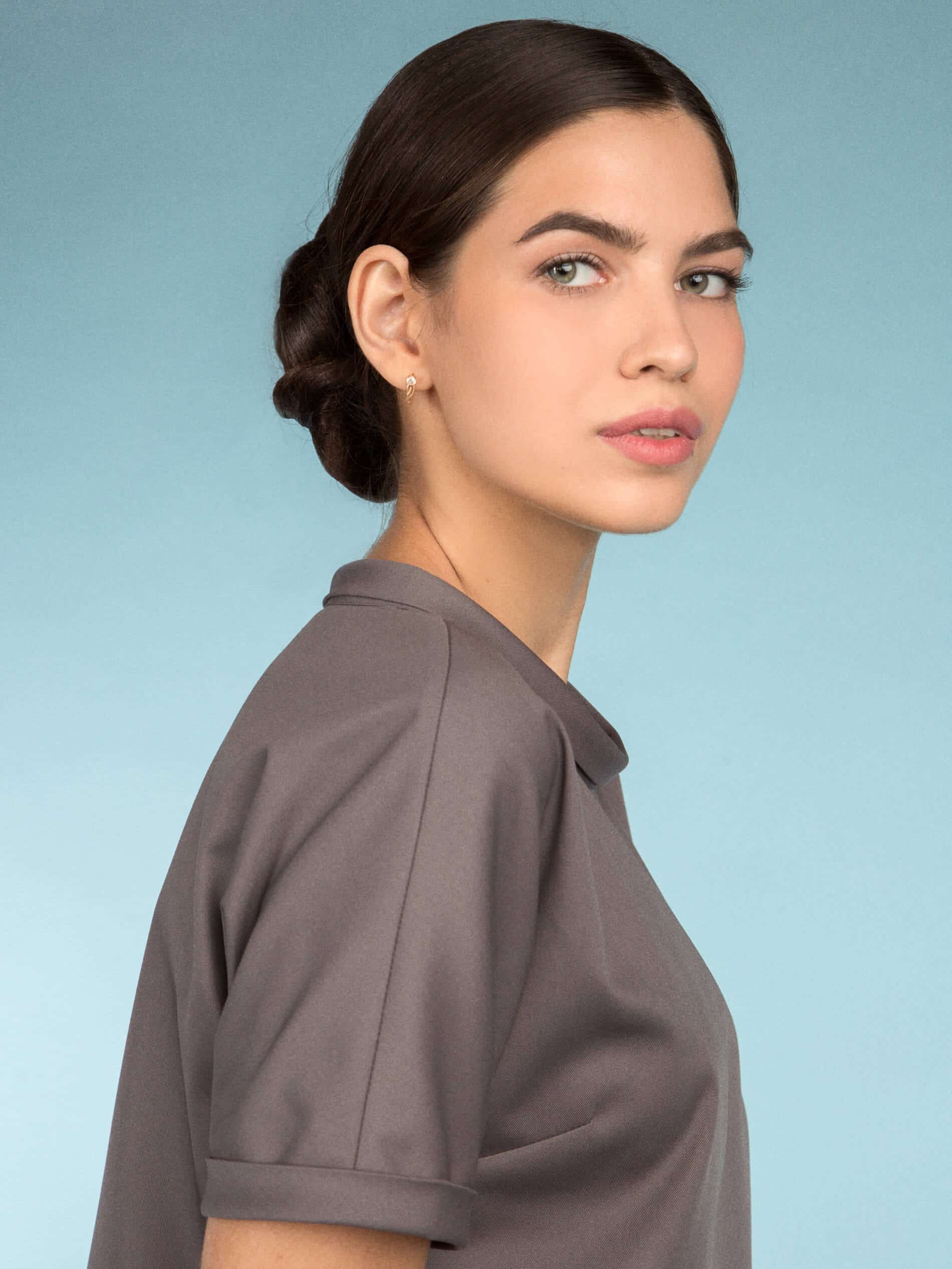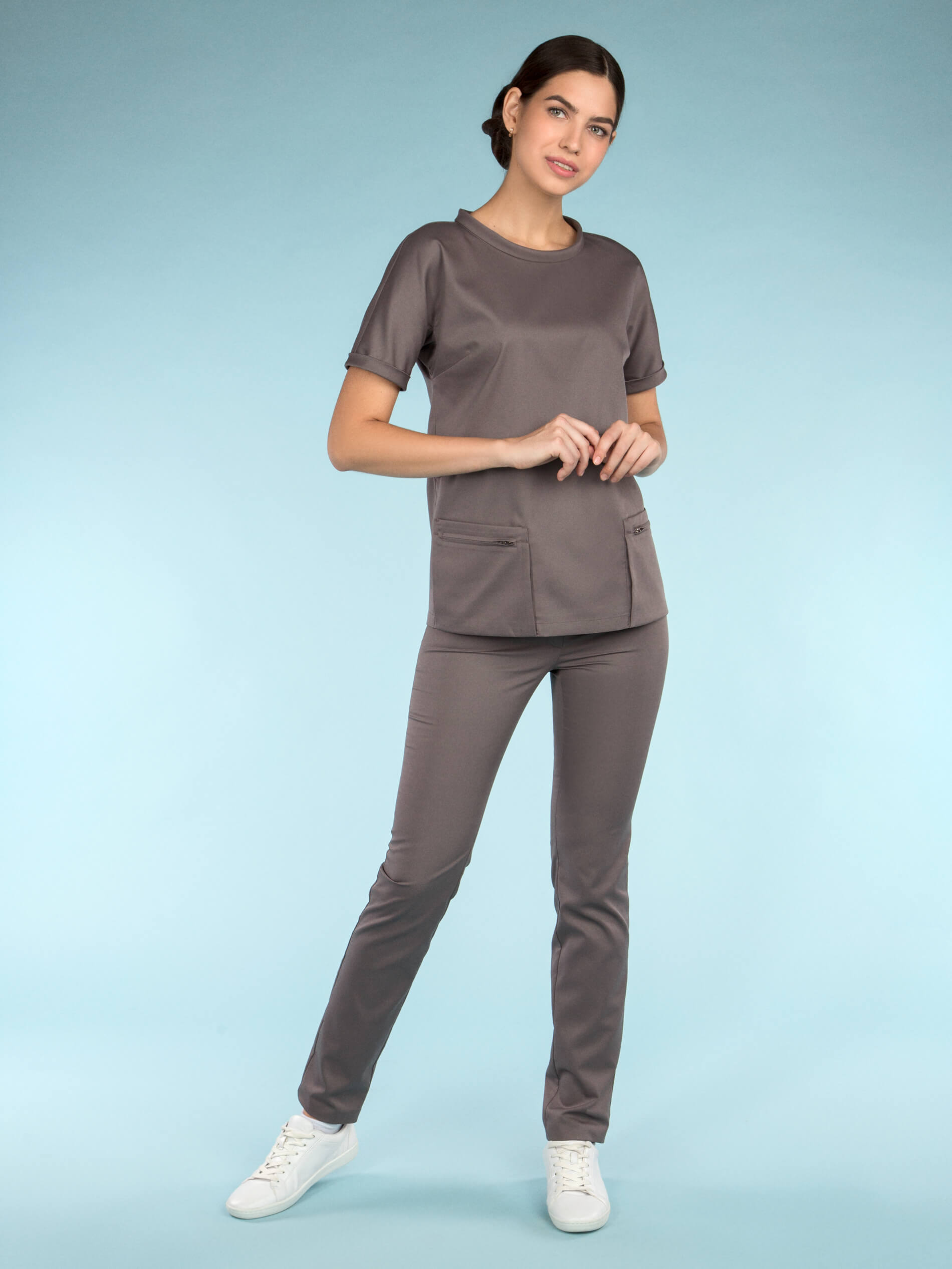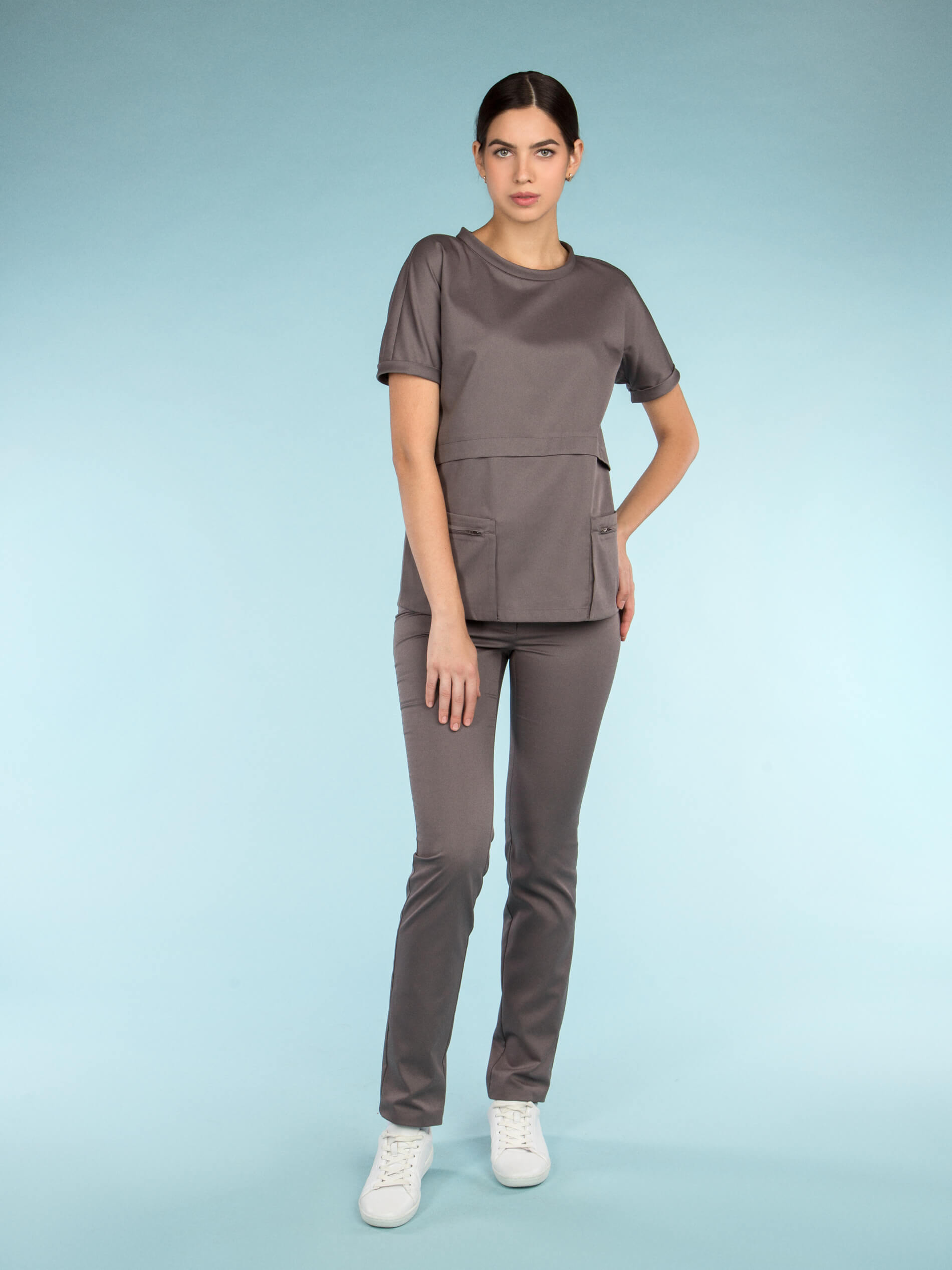 Молодежная блуза выглядит стильно, но позволяет оставаться в рамках дресс-кода. Рез фигурной формы и складки, кажущаяся многослойность скрывают недостатки фигуры и приближают свою обладательницу к совершенству. Привлекают особое внимание графичные карманы – портфели, застегивающиеся на молнию и элегантный воротник "хомут".