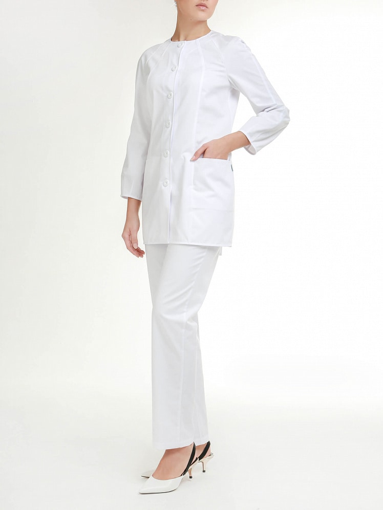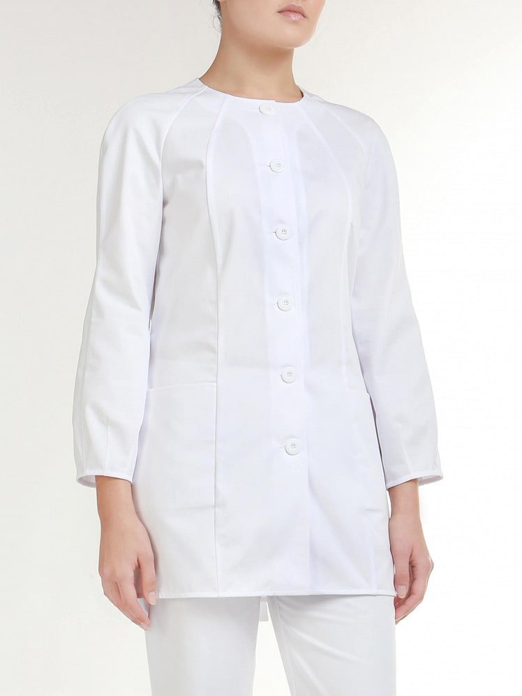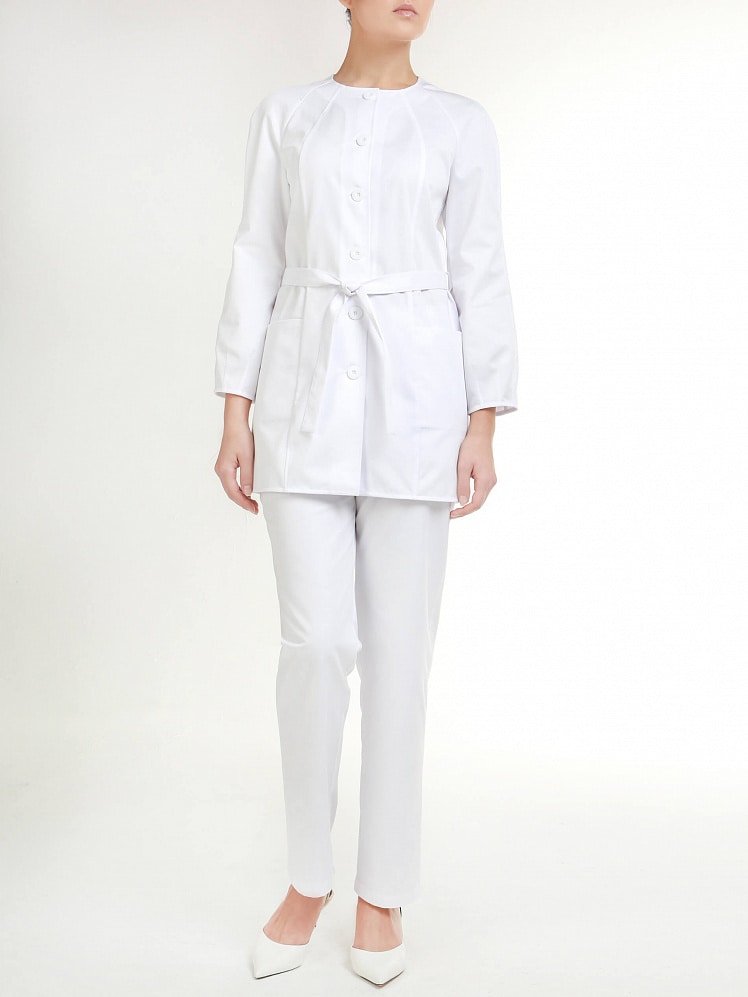 Особенностью этом медицинской блузы, выполненной в романтическом стиле, являются конструктивные линии рельефов, боковых швов и рукавов-реглан, которые намеренно акцентируют внимание на чарующих изгибах женской фигуры. Съемный пояс дополнительно подчеркивает талию, а рукава, объемные в нижней части, оттеняют хрупкость и красоту женских рук.