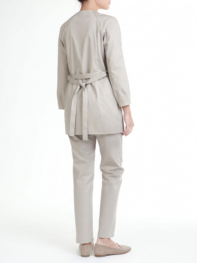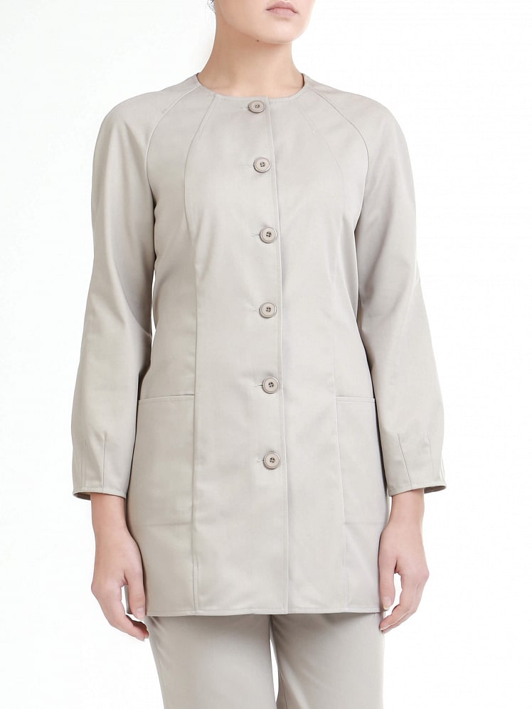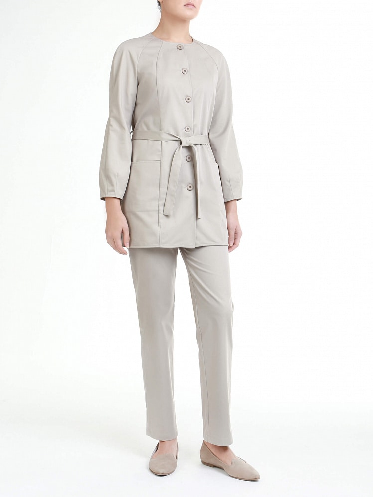 Особенностью этом медицинской блузы, выполненной в романтическом стиле, являются конструктивные линии рельефов, боковых швов и рукавов-реглан, которые намеренно акцентируют внимание на чарующих изгибах женской фигуры. Съемный пояс дополнительно подчеркивает талию, а рукава, объемные в нижней части, оттеняют хрупкость и красоту женских рук.