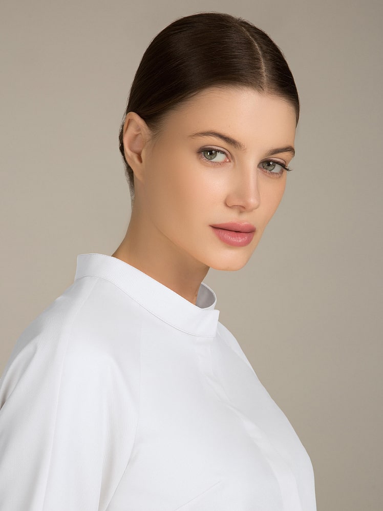 Выразительная блуза трапециевидного силуэта приковывает взгляды и вызывает неподдельный интерес благодаря акцентам на нестандартные современные детали.