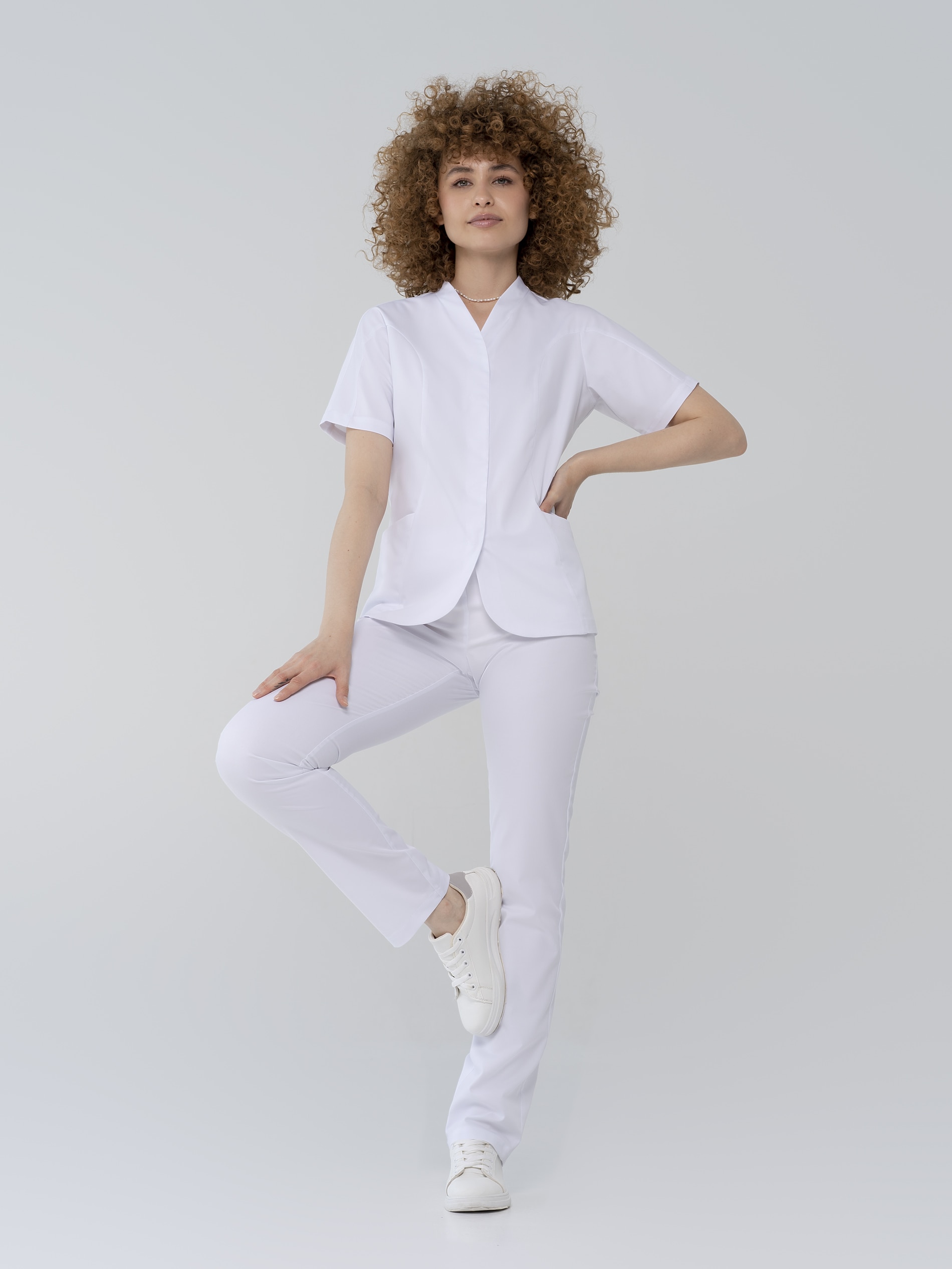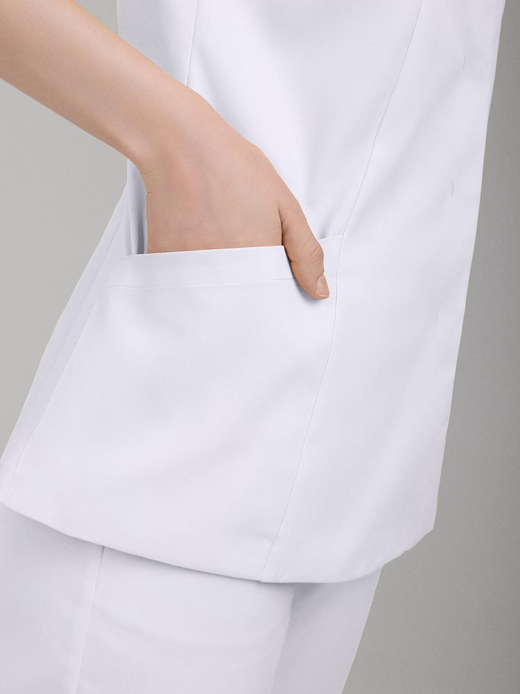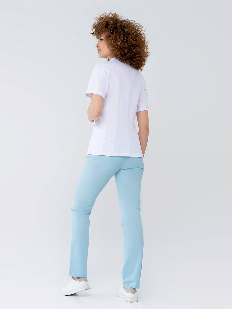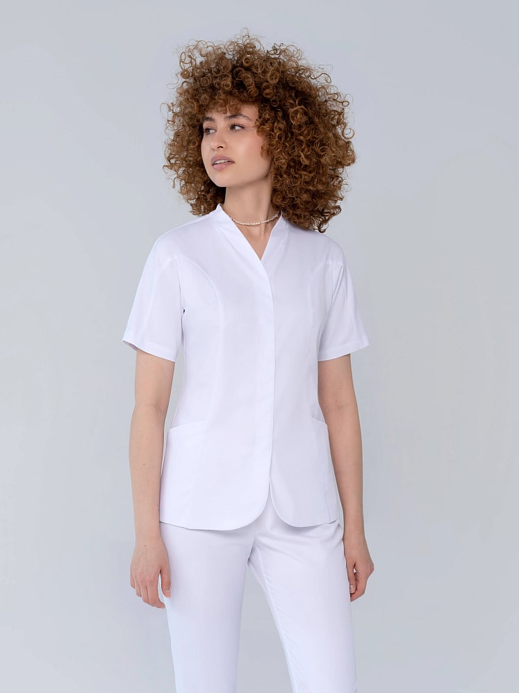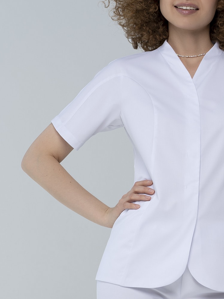 Элегантная модель медицинской блузы с короткими рукавами очаровывает в первого взгляда. Полуприлегающий силуэт, цельнокроенный рукав и фигурные рельефы повторяют естественные изгибы тела. V - образный вырез горловины и вертикальная планка потайной застежки на кнопки зрительно вытягивают силуэт, а скругленный нижний край борта придает мягкости.