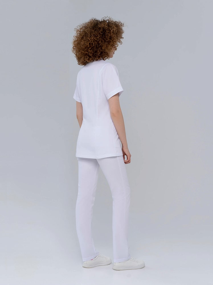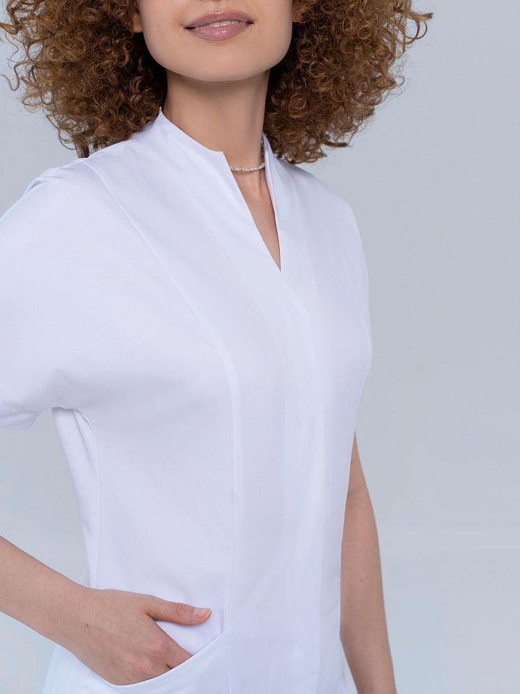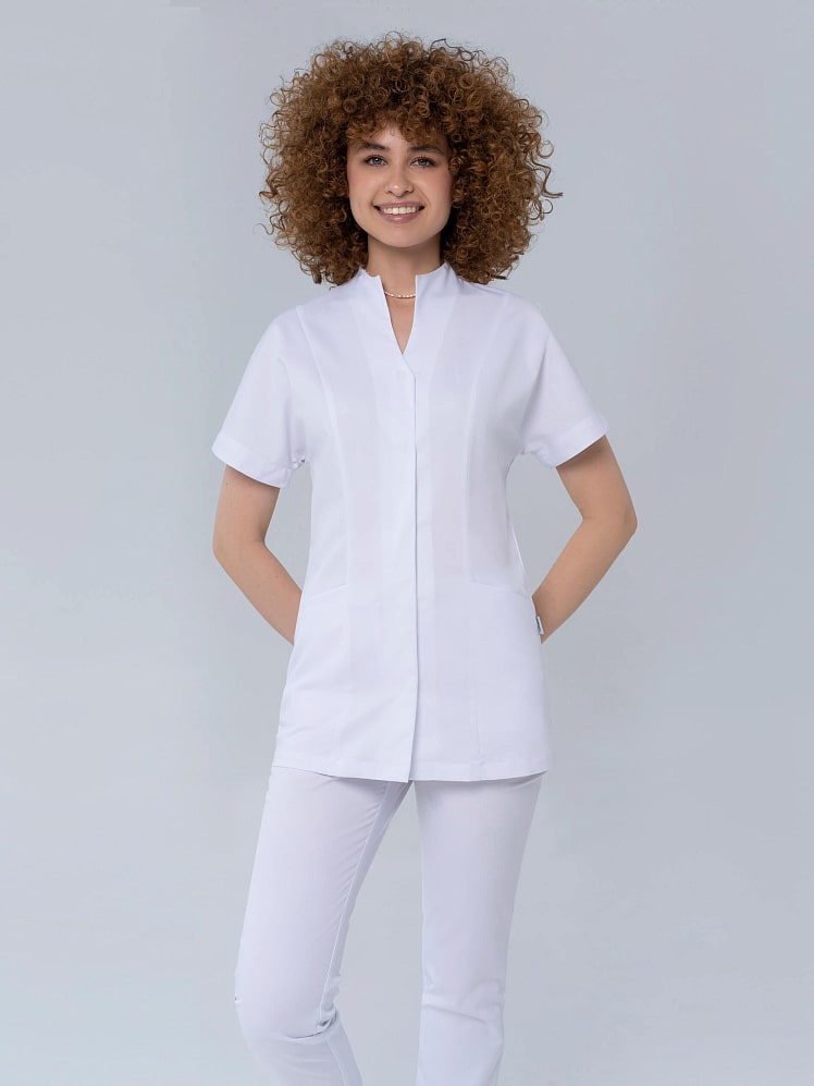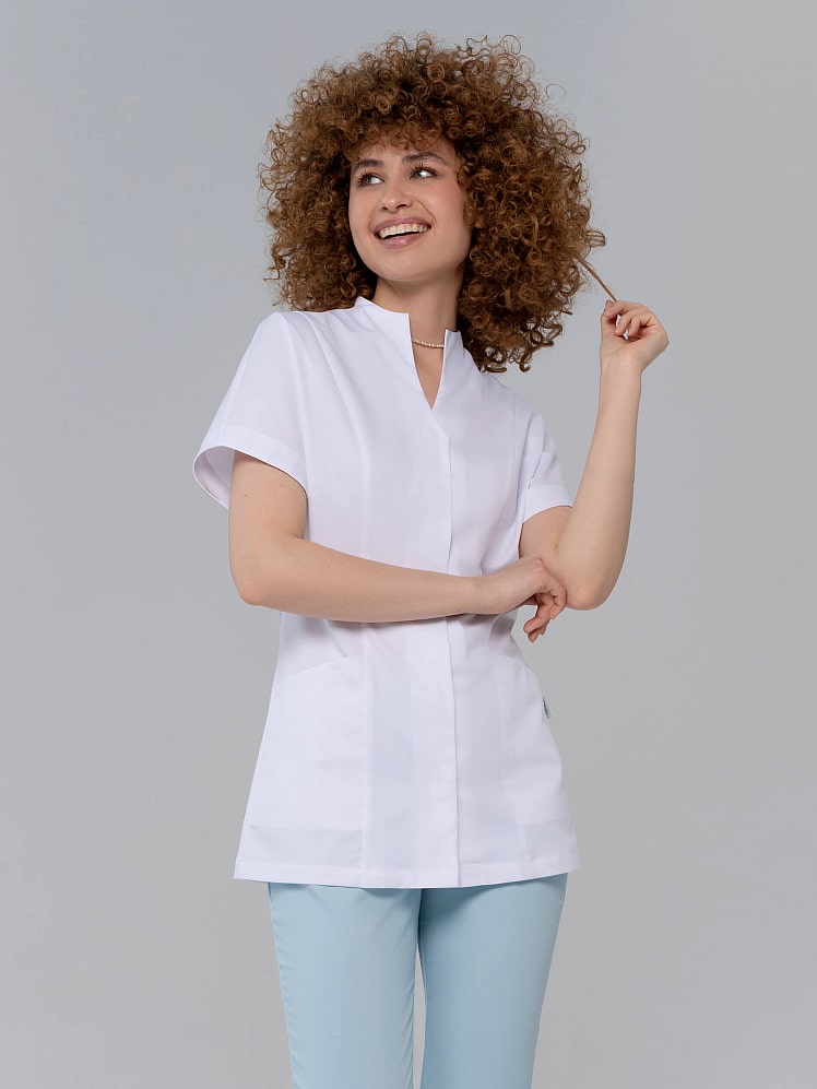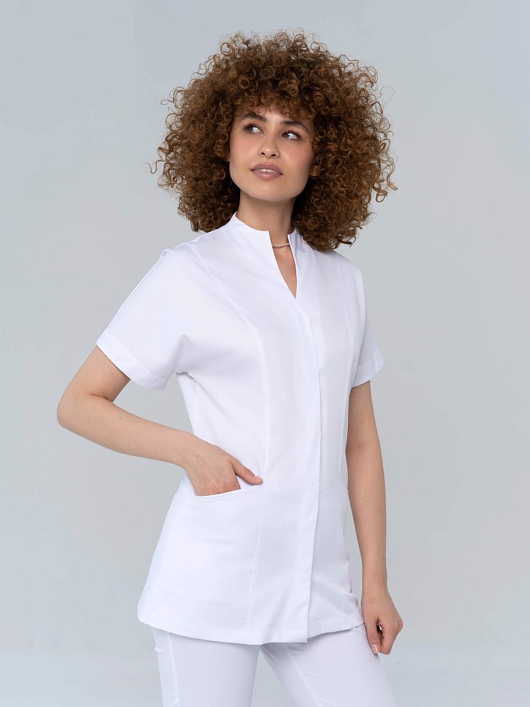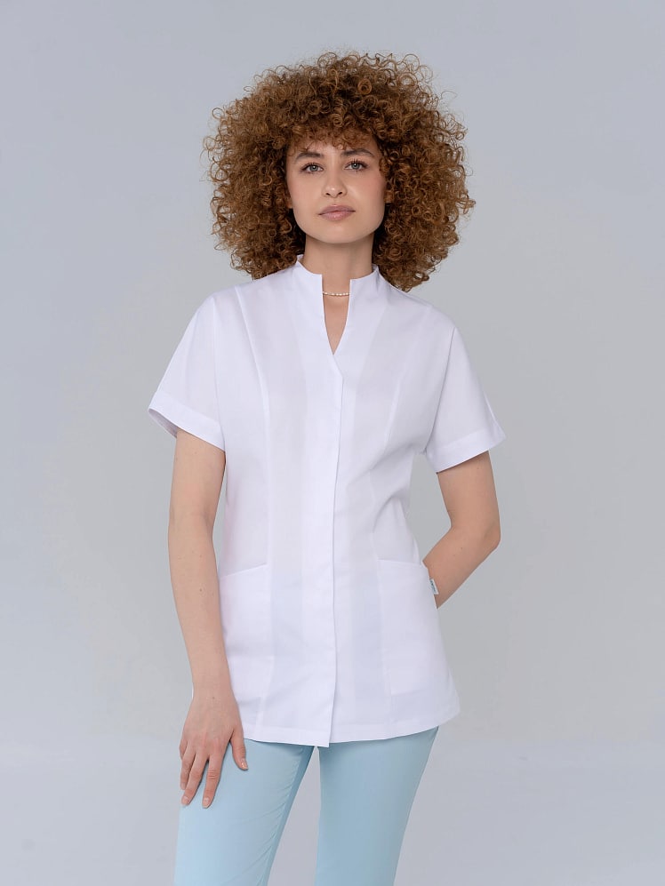 Женская медицинская блуза создает эффектный и элегантный образ врача или медсестры. Эта рубашка с коротким рукавом предназначена в качестве специальной одежды для медицинских работников, для сотрудников косметологических салонов или руководителей клиник. которым необходима комфортная форма для повседневной работы. V - образный вырез горловины и оригинальный воротник-стойка подчеркивают линию шеи и смотрятся необыкновенно женственно, изящно и утонченно. 2 удобных кармана позволят держать необходимые мелочи под рукой. Красивая качественная рубашка медицинская женская с карманами застегивается на кнопки, гармонично сочетается с медицинскими брюками или юбкой. Современная блуза медицинская для женщин и девушек, несмотря на кажущуюся простоту, прекрасно отметит индивидуальность и неповторимость своей обладательницы. Стильная форма медицинская больших и маленьких размеров  прекрасно вписывается в повседневный рабочий стиль одежды главврача или администратора клиники, косметолога или стоматолога. Мягкая стрейч ткань тянется, в ней не холодно зимой и не жарко летом, поддерживает терморегуляцию, обладает высокой гигроскопичностью, комфортна для ежедневного ношения. Легкая ткань не просвечивает, прочная и износоустойчивая., что делает медицинскую форму женскую подходящей для повседневного использования.
