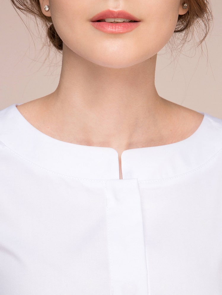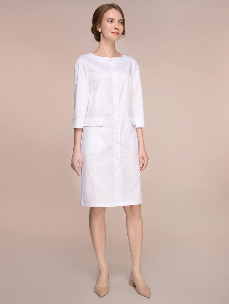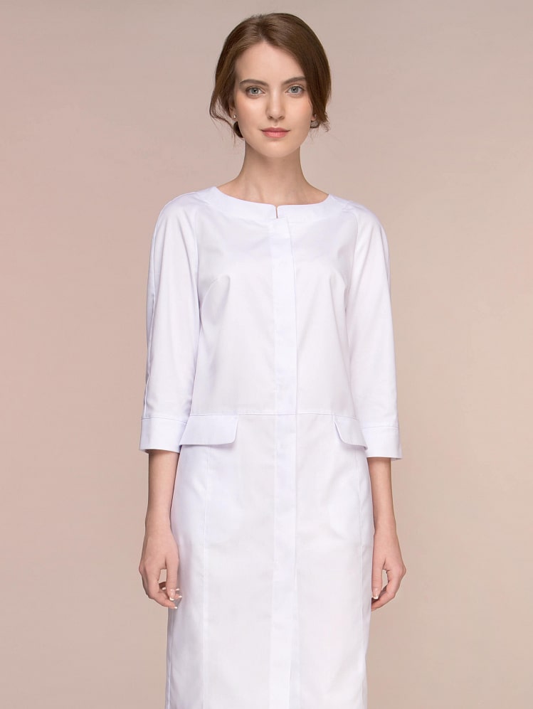 Гармоничный женственный образ данной модели обусловлен мягкой плавностью силуэта, скругленными линиями горловины и клапанов карманов. Остромодная деталь планки потайной застежки, а также рельефы в нижней части халата зрительно вытягивают силуэт, позволяют выглядеть хозяйке уверенно и безупречно.