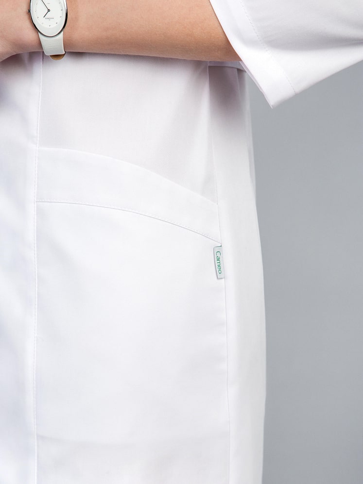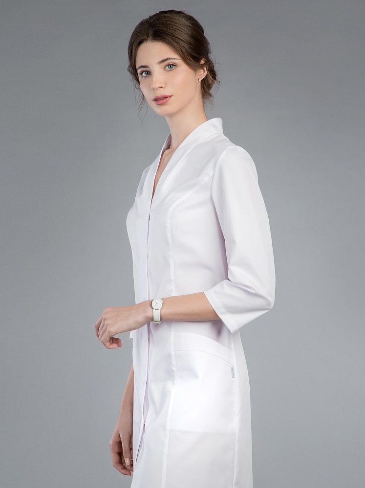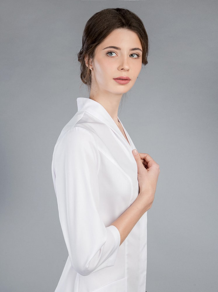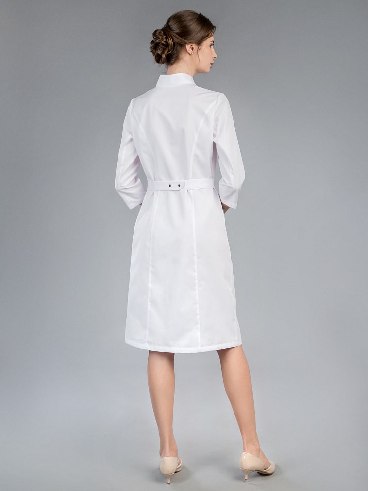 Элегантность образа создана лаконичным кроем, сдержанными четкими линиями рельефов и супатной застежки. Строгость силуэта смягчается  плавными линиями  оригинального воротника – стойки, придающего облику женственности и невероятной актуальности.