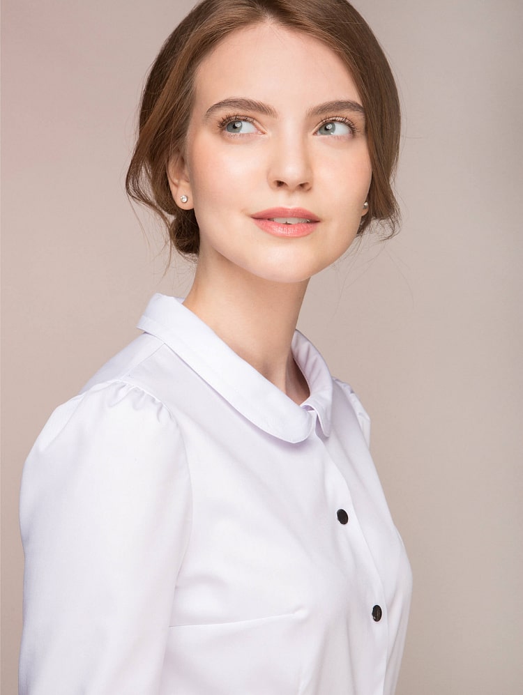 Модель адресована тем, кто чувствует себя молодой и романтичной. Облегающий лиф, подчеркнутая линия талии, мягкие складки создают возвышенный и утонченный образ, а маленький воротничок со скругленными концами придает халату легкость, юность и изящество.