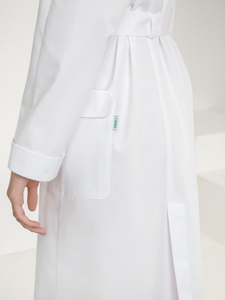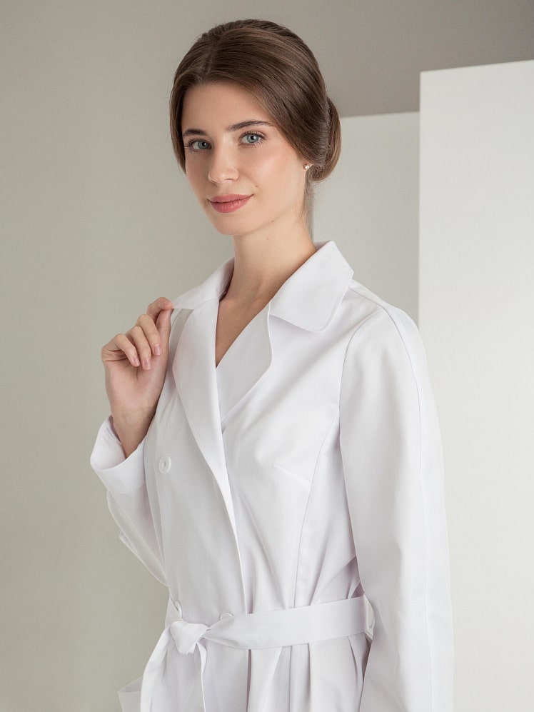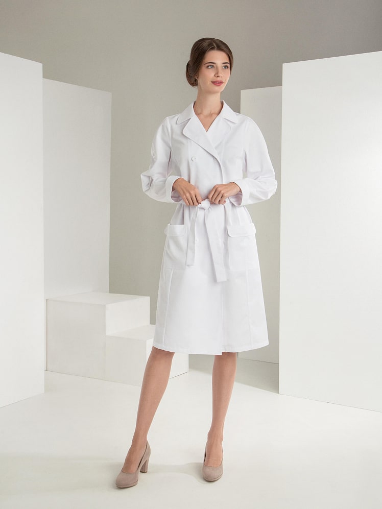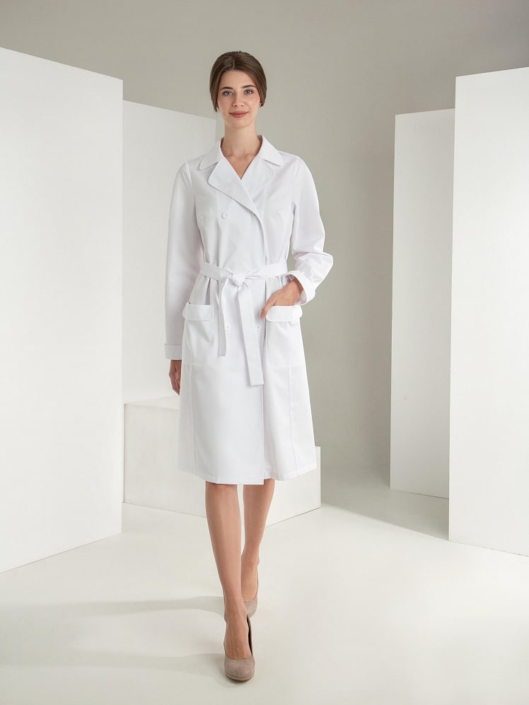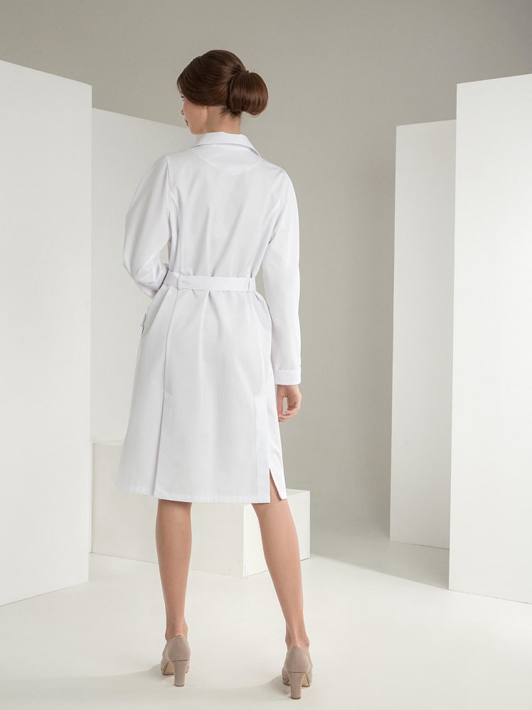 Выразительная двубортная модель халата - это беспроигрышный выбор для профессионалов. Декоративный и необходимый элемент - шлицы – обеспечивает свободу движения. Воротник в английском стиле подчеркивает элегантность модели. Накладные карманы с фигурными клапанами, манжеты с отворотом - стильные и модные детали, придающие уверенность и статусность обладательнице халата «Премиум-класса».