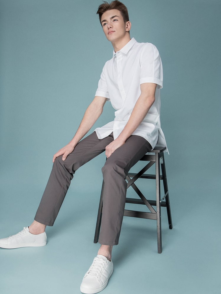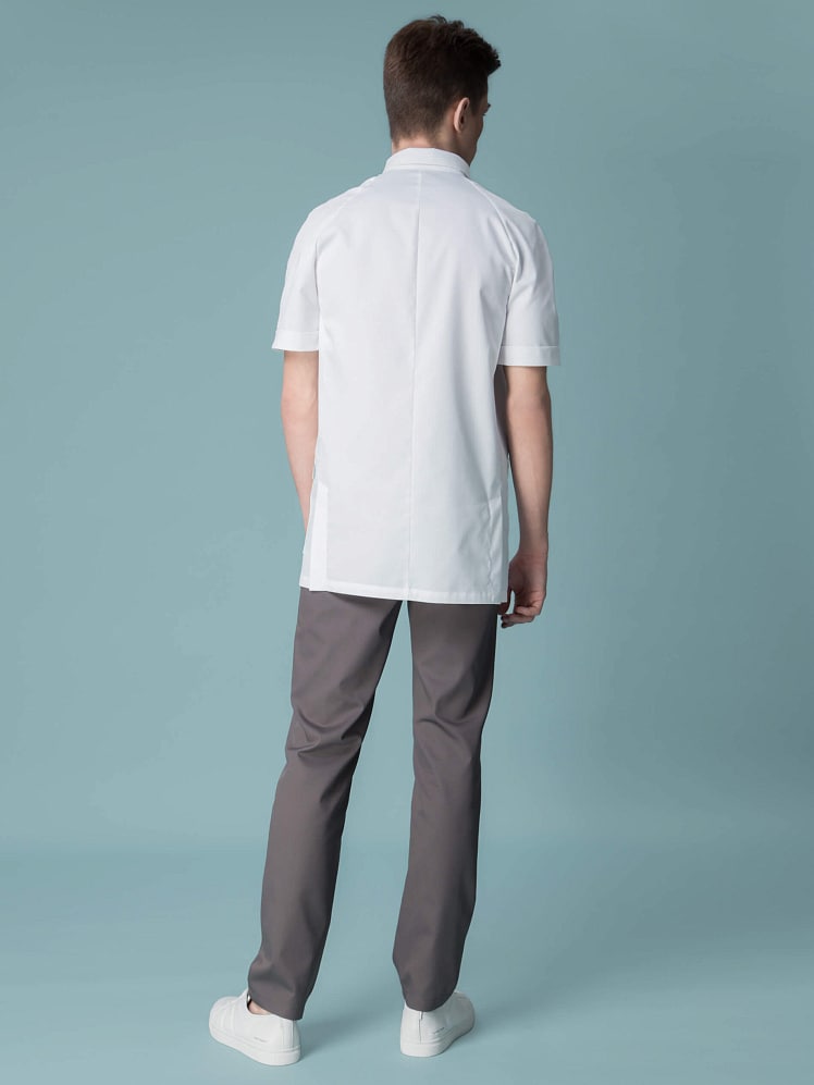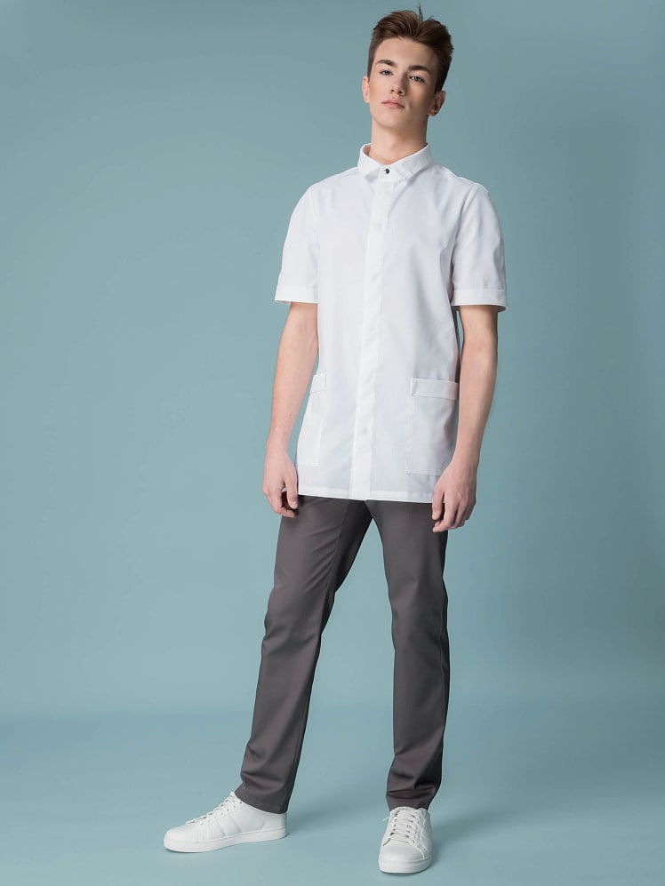 Мужской медицинский жакет комфортный, как и привычная рубашка, благодаря прямому силуэту, отложному воротнику на стойке и удобной супатной застежке на кнопки. Строгий крой подчеркивает сдержанность и элегантность своего обладателя, а вместительные карманы позволяют держать все под рукой.