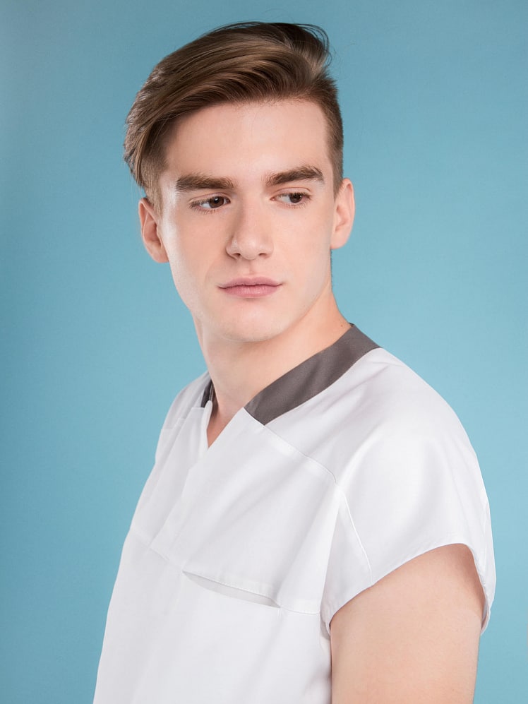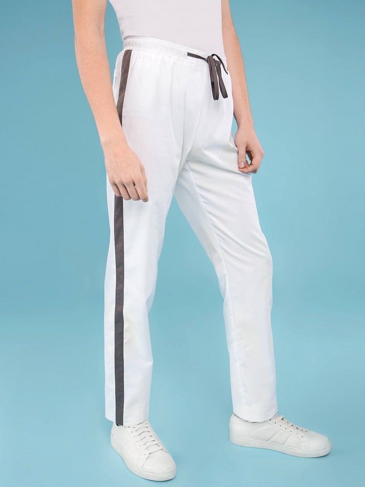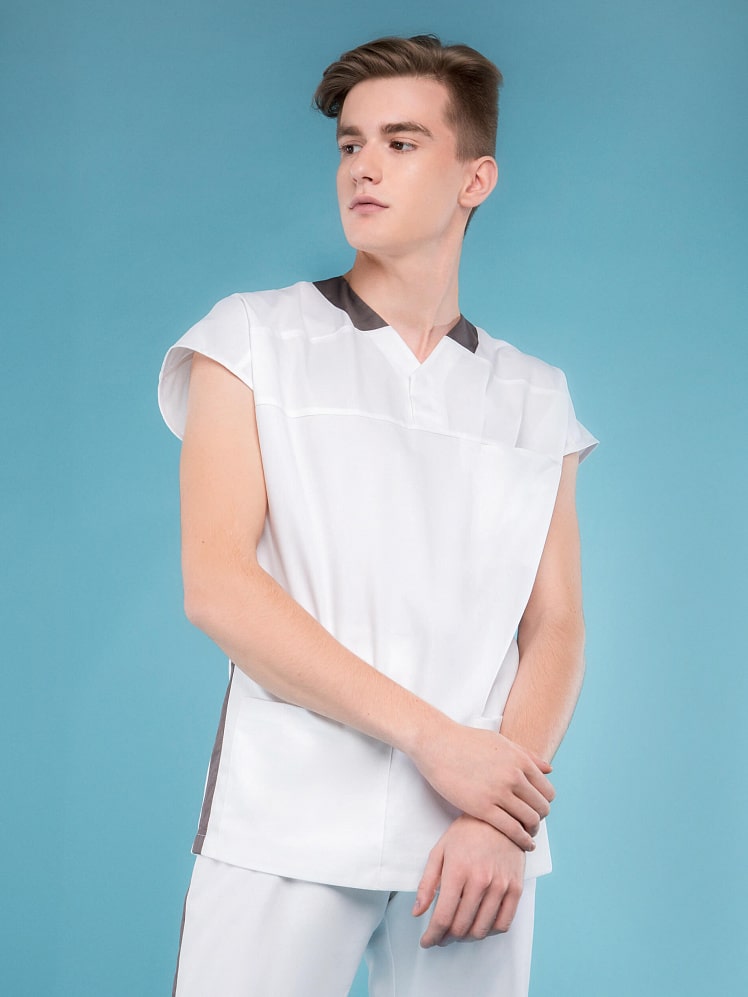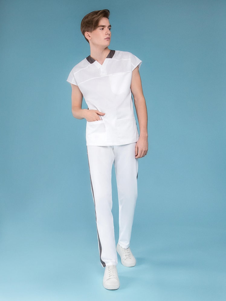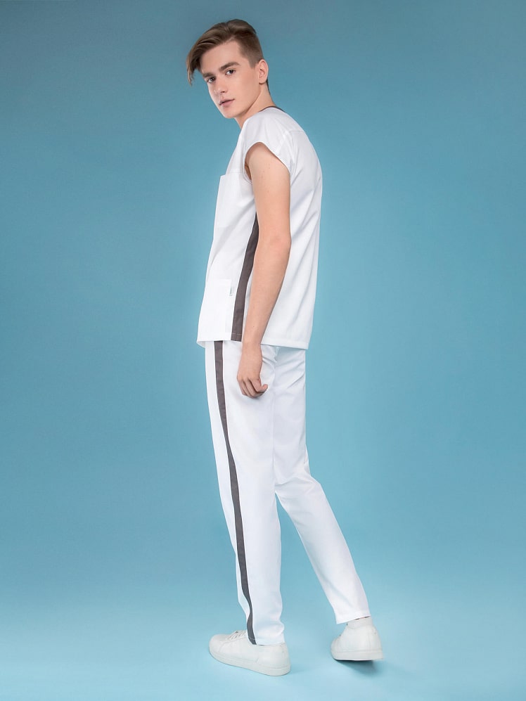 Современный силуэт костюма из спортивной коллекции покоряет с первого взгляда. Прямой фасон, отсутствие воротника, цельнокроеный рукав обеспечивают свободу и раскованность его обладателю.  А оригинально оформленная горловина и лампасы из контрастной ткани привлекают к себе внимание.