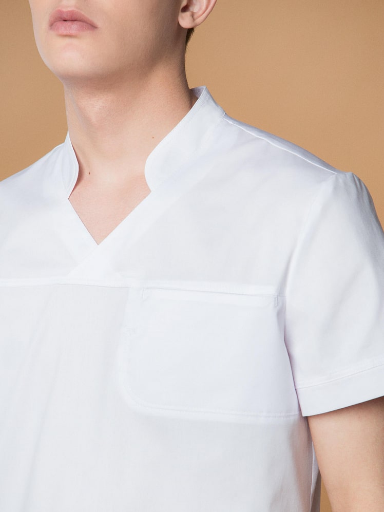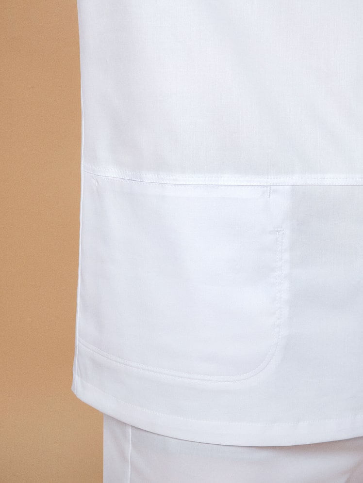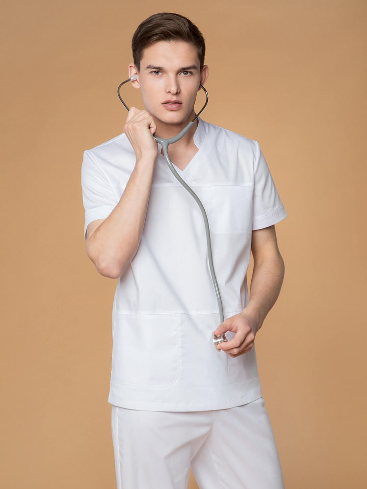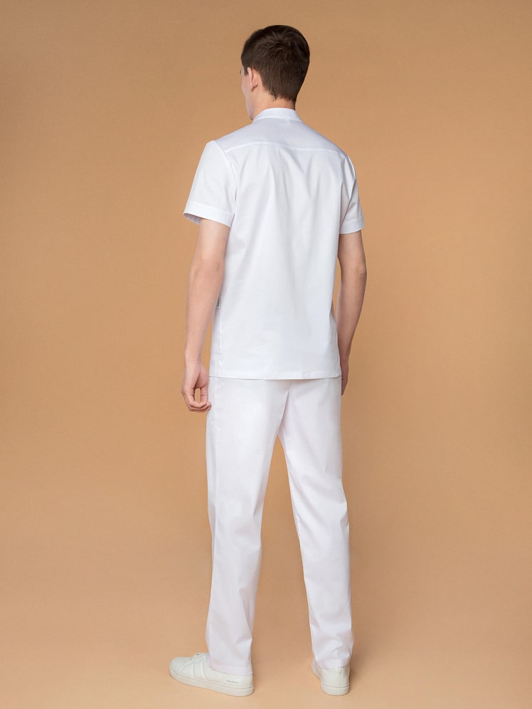 Этот костюм выбирают те, кто отдает предпочтение удобной и неброской, но при этом эффектной и элегантной одежде. Удачная конструкция модели, эластичность ткани, обеспечивающие легкость движения, позволят в полной мере реализовать свои профессиональные качества. Оригинальные карманы привлекут внимание окружающих. Необычная форма горловины с воротником-стойкой придаст свободы обладателю костюма