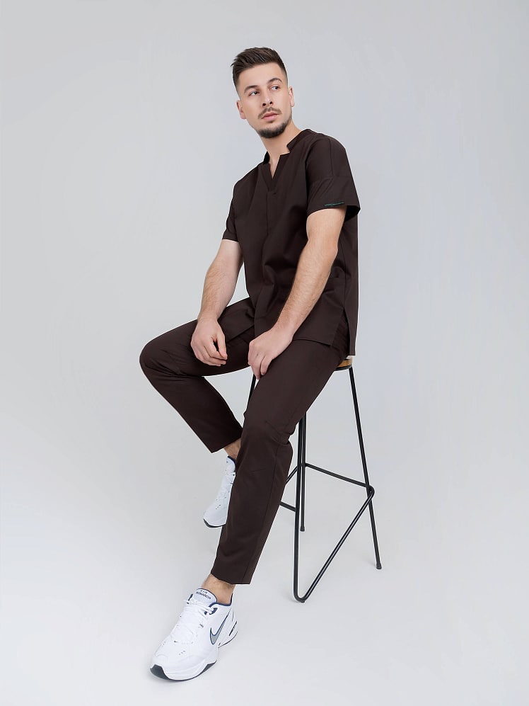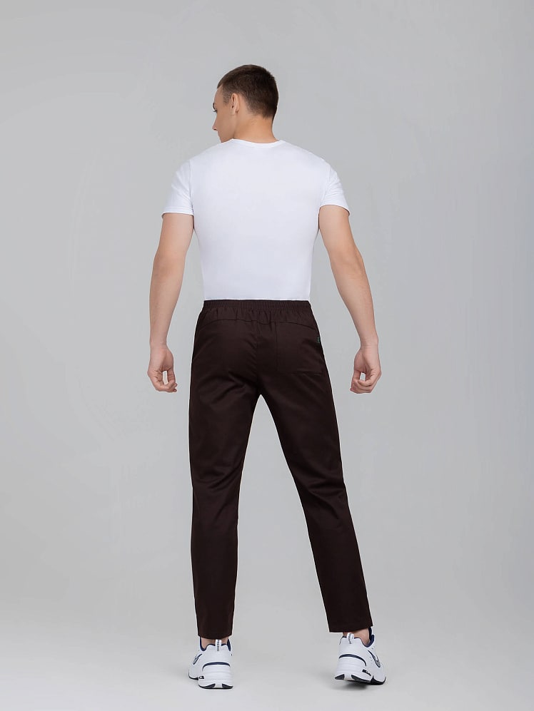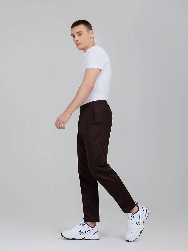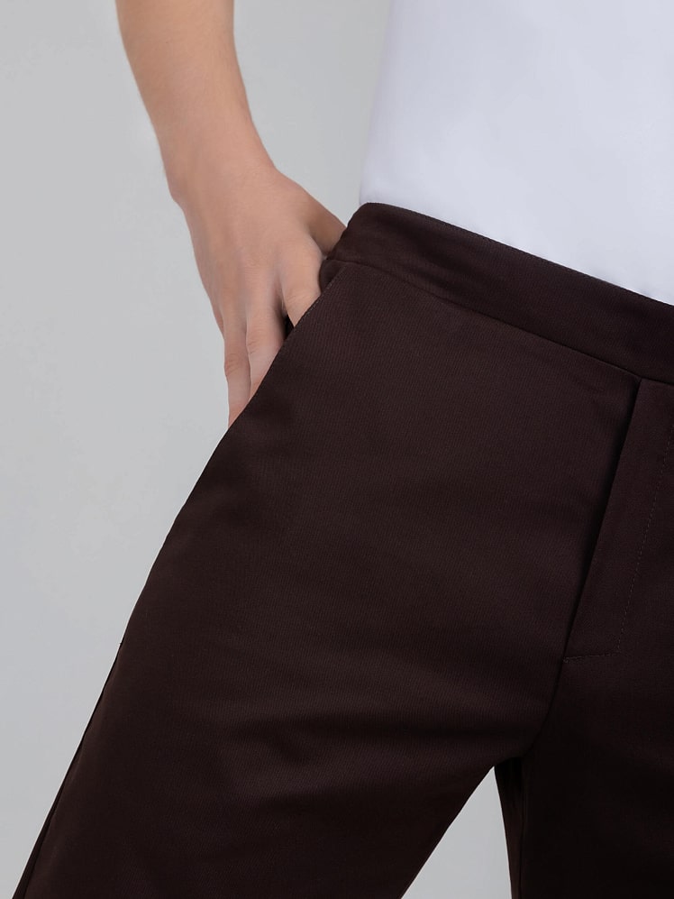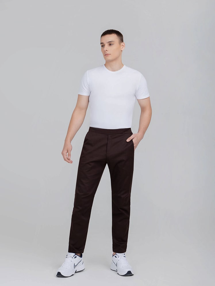 Актуальная модель брюк отличается легкостью и ощущением комфорта, чему способствуют прямой силуэт, отсутствие застежки и вытачки на уровне колен. Вместо застежки использован дизайнерский ход - имитация гульфика.  Модель проста и лаконична, благодаря чему комбинируется и с халатами, и с рубашками.