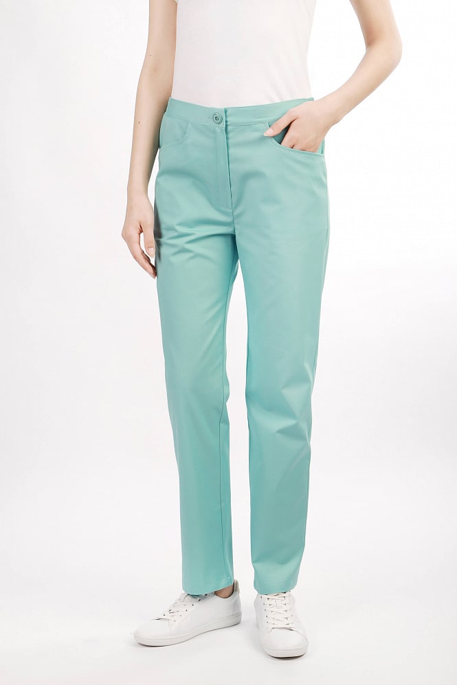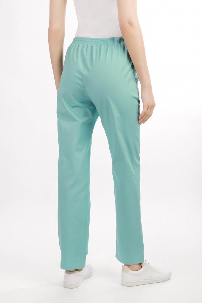 Женские прямые брюки выполнены в классическом стиле. Они имеют практически одинаковую ширину брючин по всей длине и безупречную посадку по талии и бедрам, которая дополнительно обеспечивается эластичной вставкой в поясе по спинке. Благодаря особенности кроя, этот фасон подходит любому типу фигуры. Боковые карманы добавляют брюкам функциональности. Модель проста и лаконична, благодаря чему комбинируется и с халатами, и с блузами.